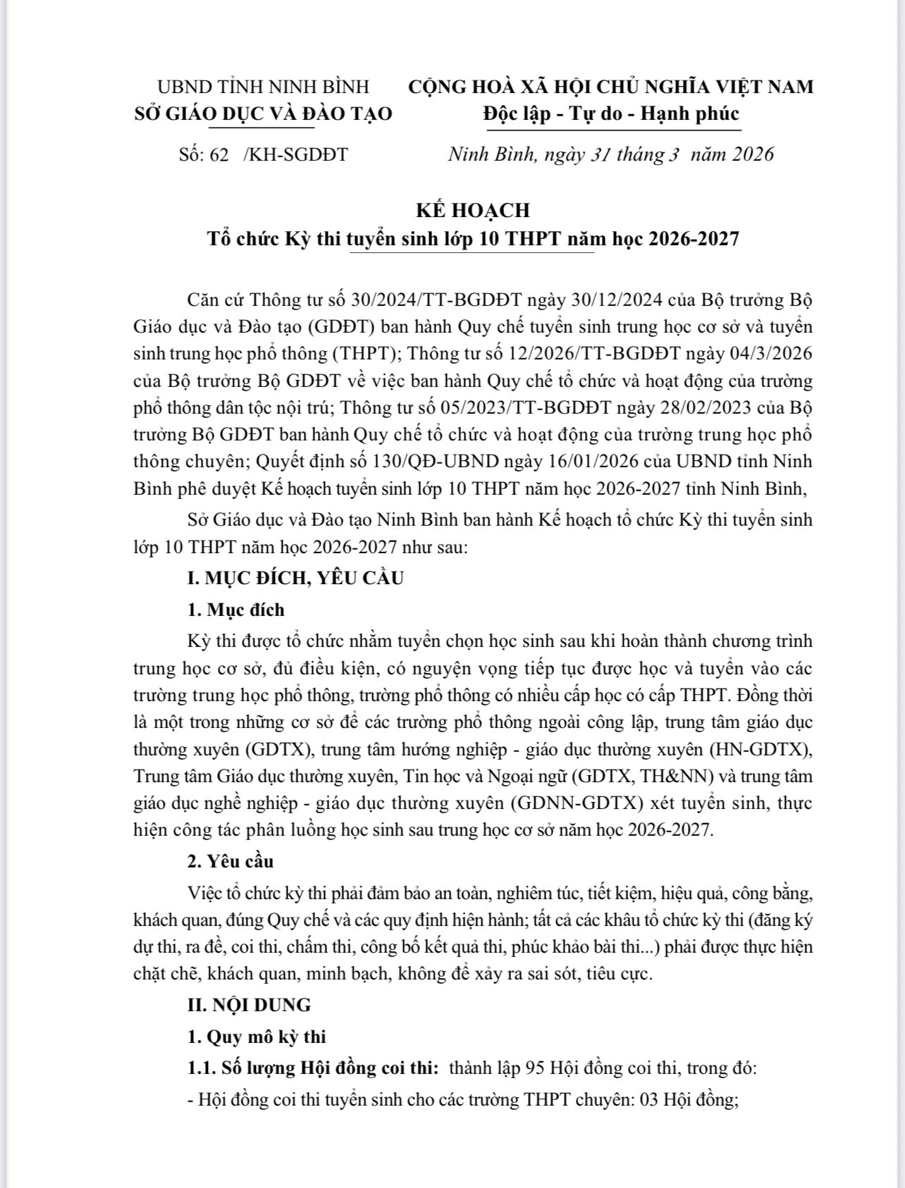 Kế hoạch tuyển sinh lớp 10 THPT năm học 2026-2027