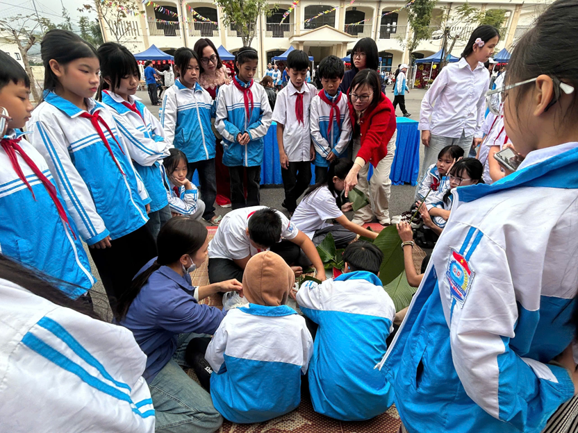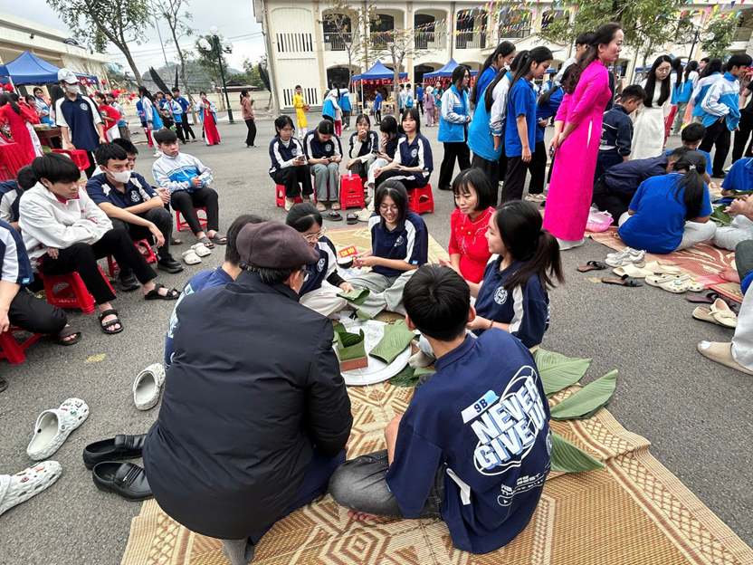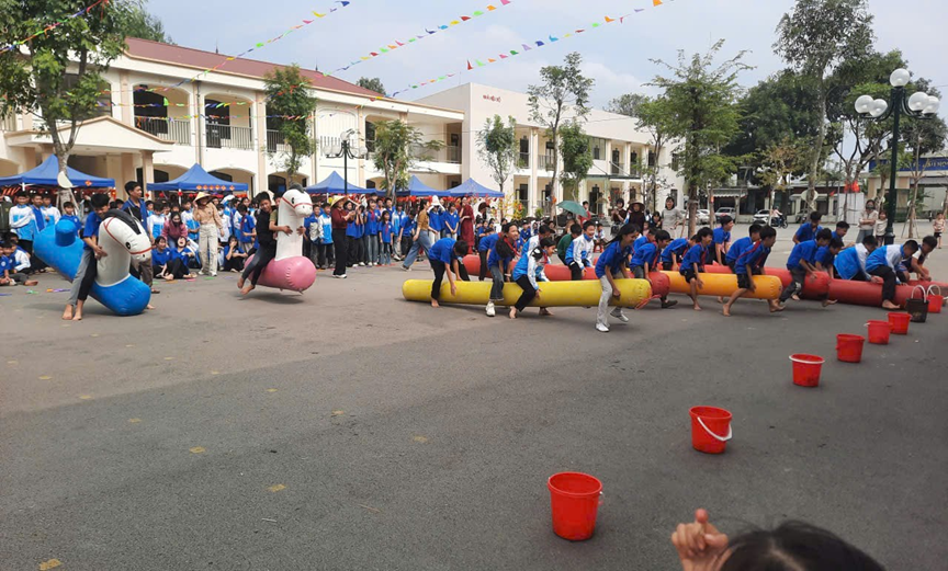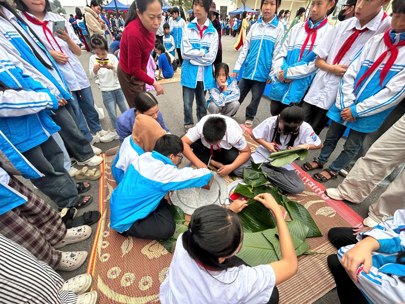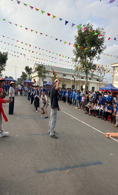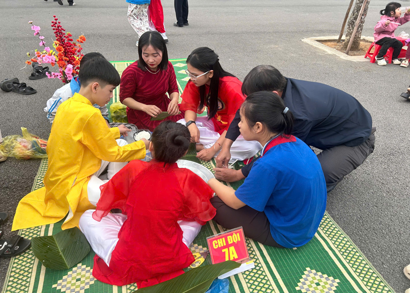 Chuỗi hoạt động trải nghiệm diễn ra sôi nổi, hấp dẫn, mang đậm hương vị Tết cổ truyền. Ở phần thi gói bánh chưng, những đôi tay khéo léo, những ánh mắt tập trung đã cùng nhau gói ghém không chỉ chiếc bánh xanh vuông vắn mà còn là tình thân và nét đẹp văn hóa dân tộc. Rung chuông vàng mang đến không khí hào hứng, gay cấn với những câu hỏi bổ ích; kéo co làm bùng nổ sân trường bởi tiếng reo hò cổ vũ đầy quyết tâm; còn thuyết trình lán trại lại là dịp để các em tự tin thể hiện sự sáng tạo, khả năng giao tiếp và tinh thần làm việc nhóm. Xen kẽ trong chuỗi hoạt động là các trò chơi team building vui nhộn, giúp học sinh phối hợp nhịp nhàng, xích lại gần nhau hơn, lan tỏa mạnh mẽ tinh thần đoàn kết, sẻ chia, đồng lòng vượt thử thách.