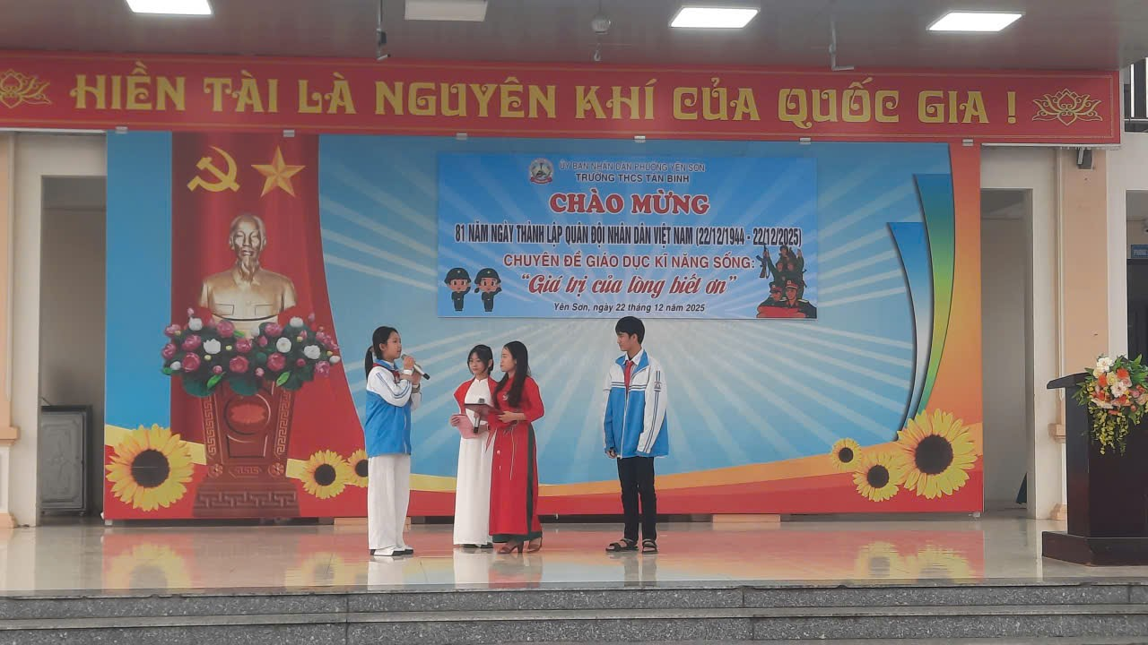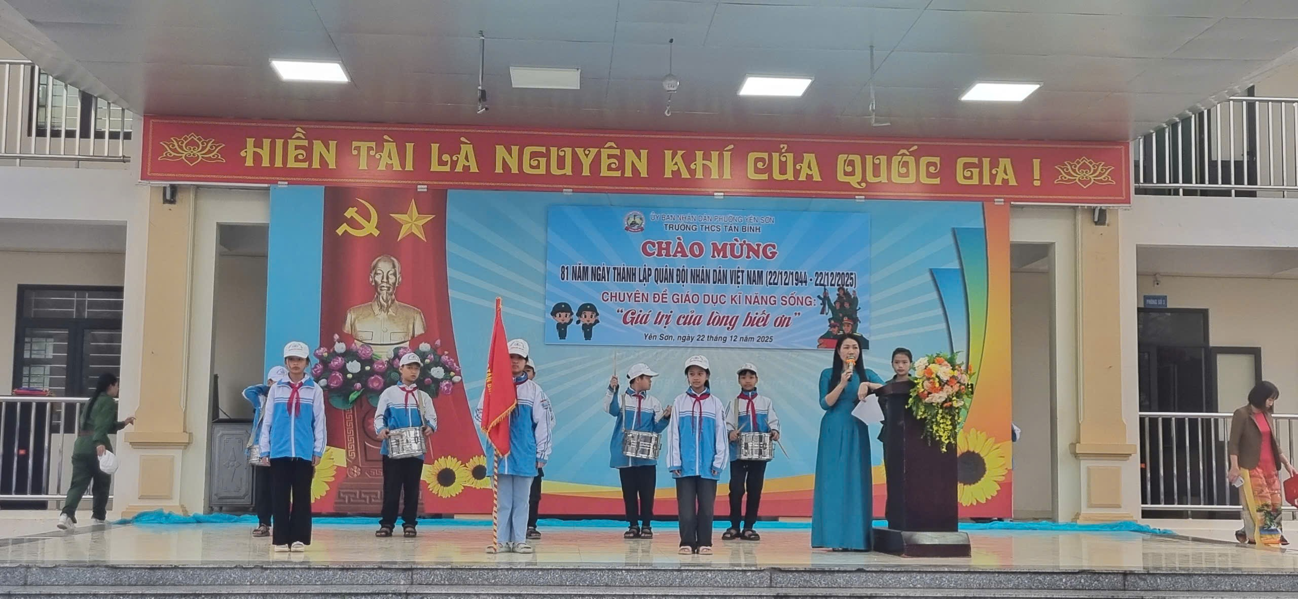 Hòa chung không khí kỷ niệm 81 năm Ngày thành lập Quân đội Nhân dân Việt Nam, sáng thứ Hai hôm nay, trường THCS Tân Bình đã tổ chức tiết chào cờ đặc biệt với chuyên đề Giáo dục kỹ năng sống: ‘Giá trị của lòng biết ơn’. Dưới sự hướng dẫn của cô giáo Phạm Thị Huyền Trang, buổi chuyên đề không chỉ tô điểm cho sân trường vẻ đẹp của lòng tự hào dân tộc mà còn để lại những dư âm xúc động, sâu sắc trong lòng mỗi học sinh.